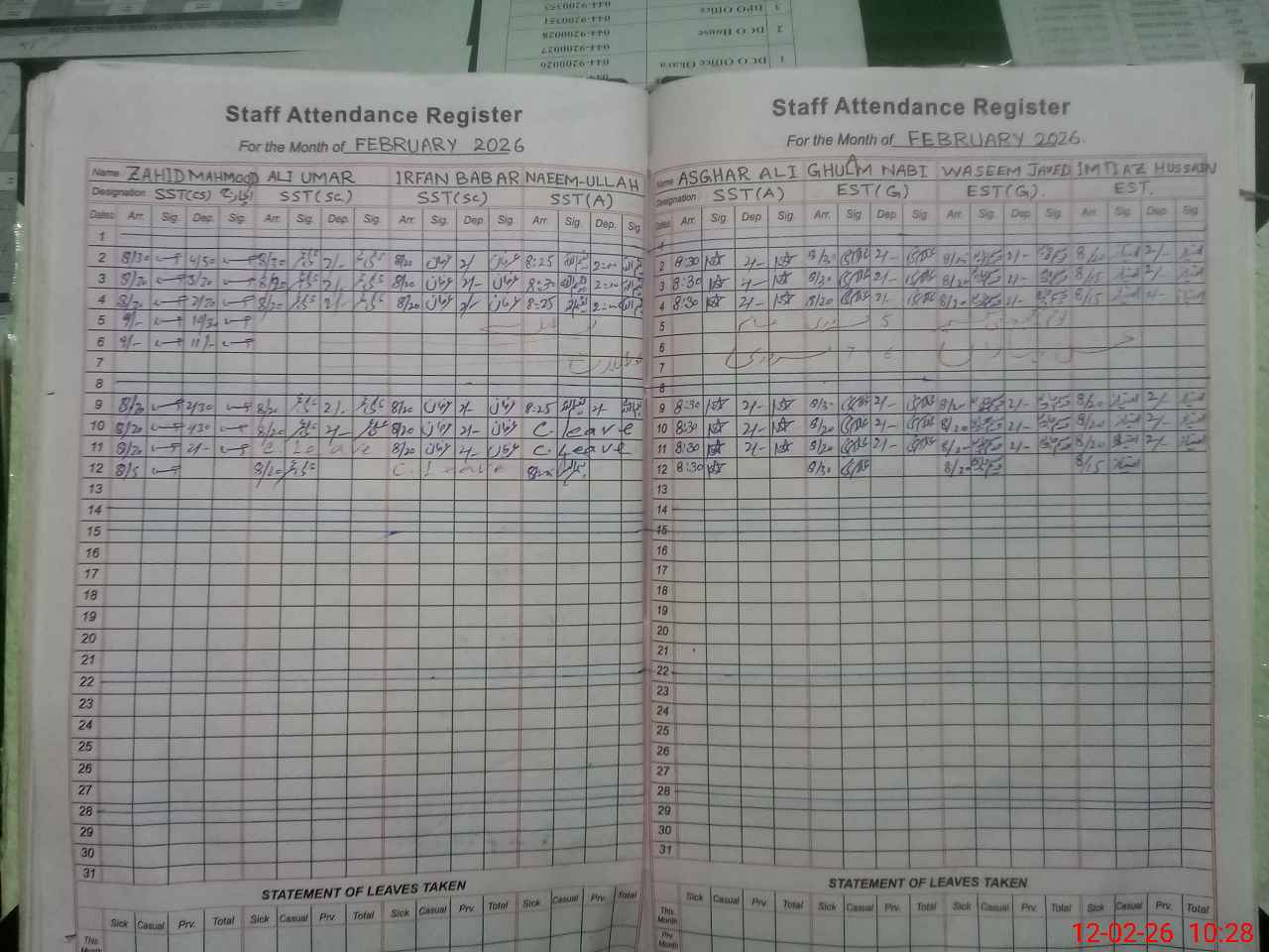 | CNIC | Full Name | Designation | R/C | Absence During Last Calender Month |