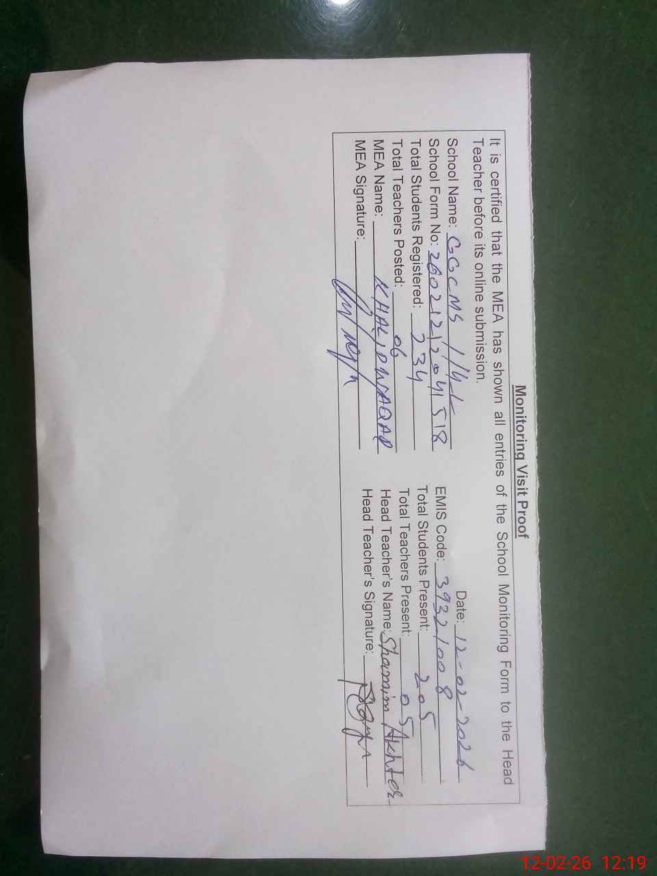 | Attendance Register | Head Teacher | MEA with School | Visit Proof |