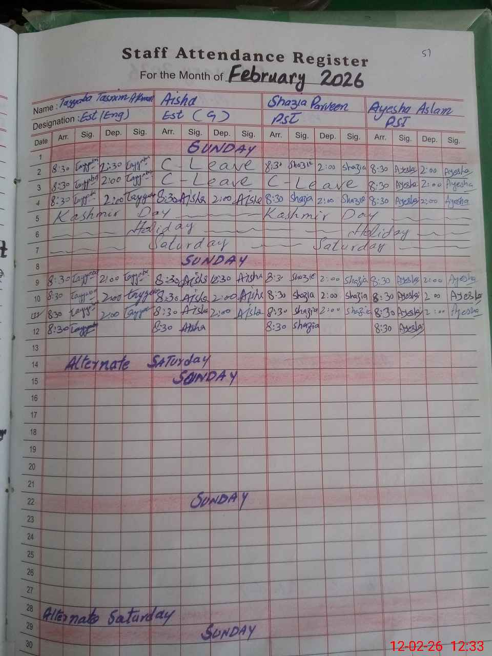 | No. of Students Present - Female | 0 | 0 | 34 | 31 | 22 | 28 | 29 | 214 | ||||||||