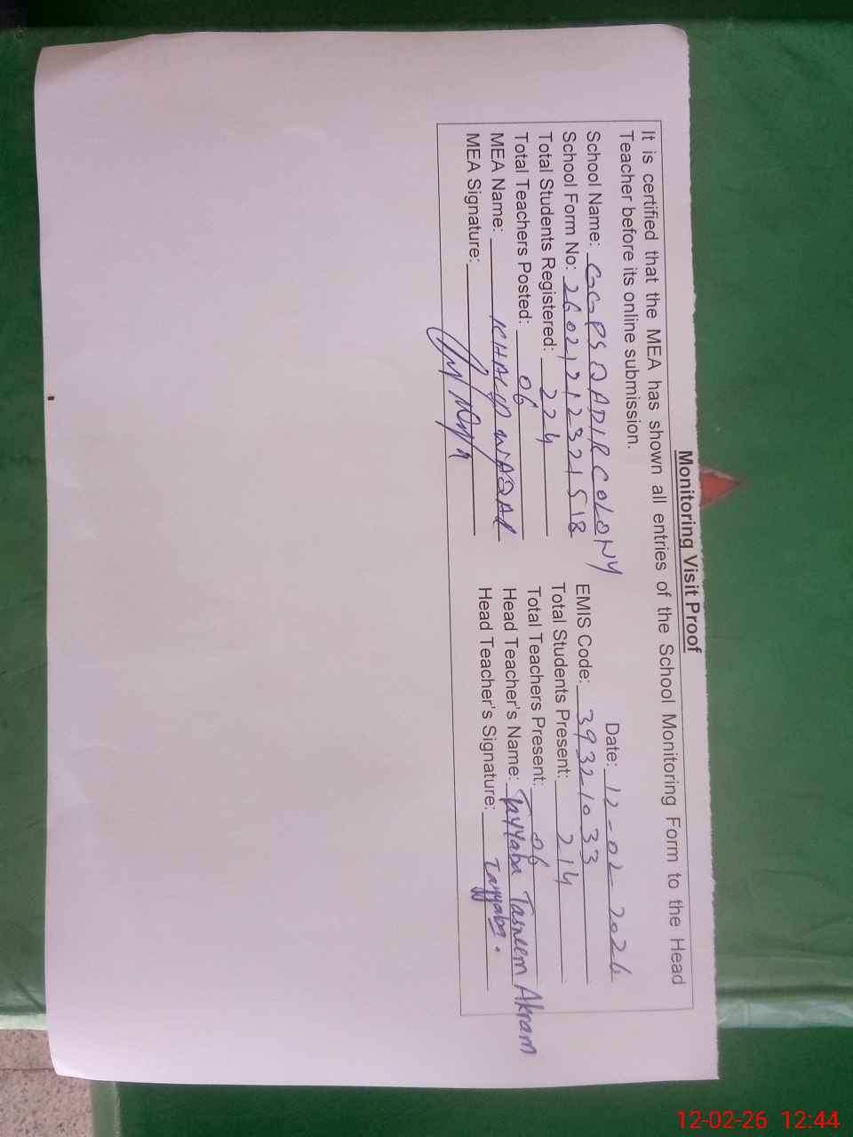| Attendance Register | Head Teacher | MEA with School | Visit Proof |
