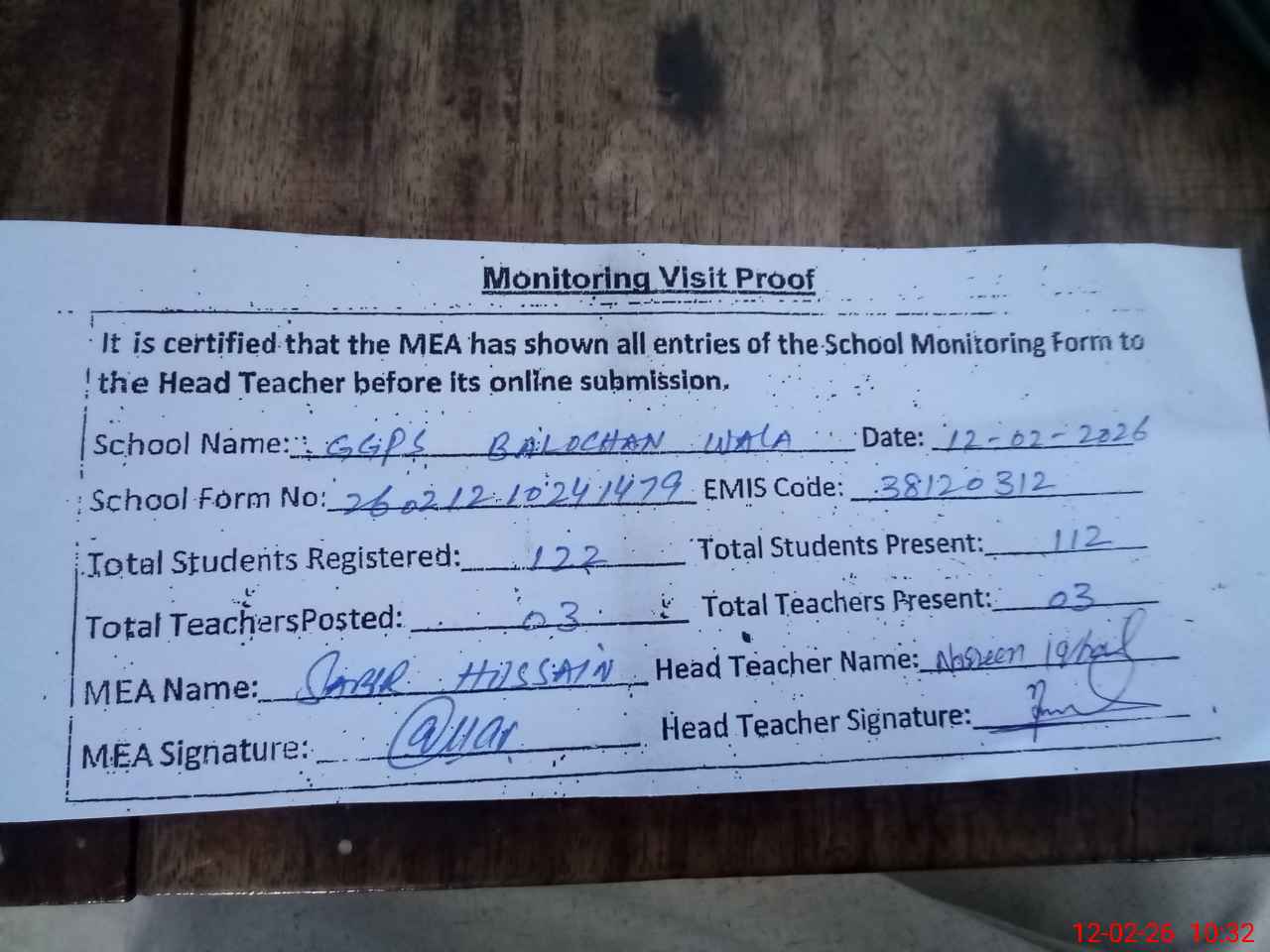 | EMIS Code: 38120312 | Name of School: GGPS BALOCHAN WALA | |||
