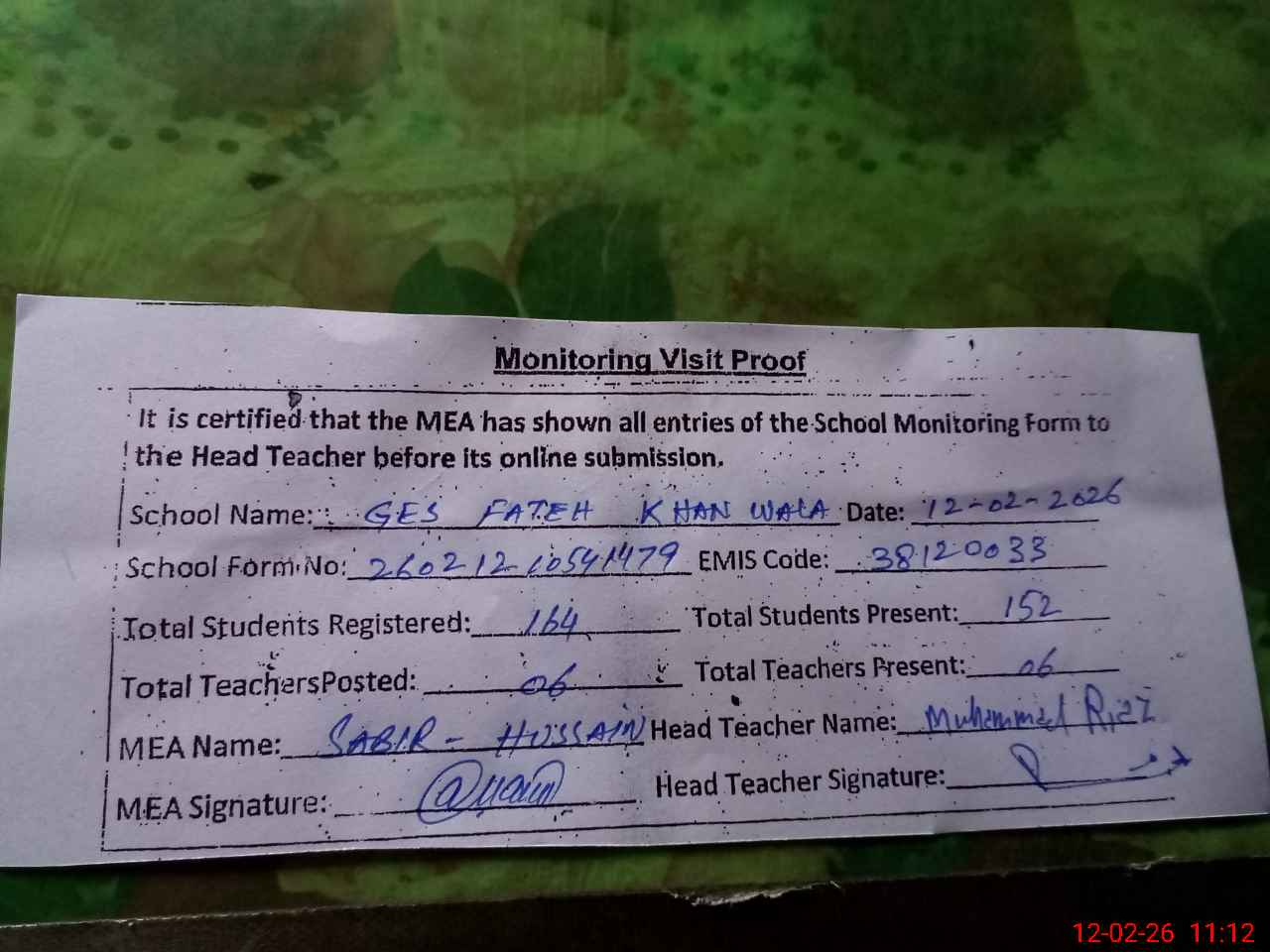 | Attendance Register | Head Teacher | MEA with School | Visit Proof |