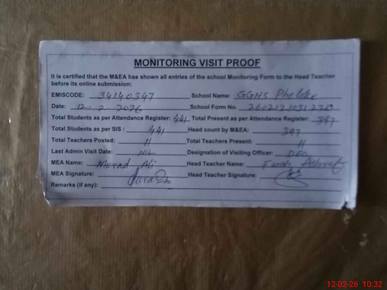 | Certified that this School was Inspected by the Undersigned MEA/DMO Today and the Information Stated Above is as Per Record. | |||||