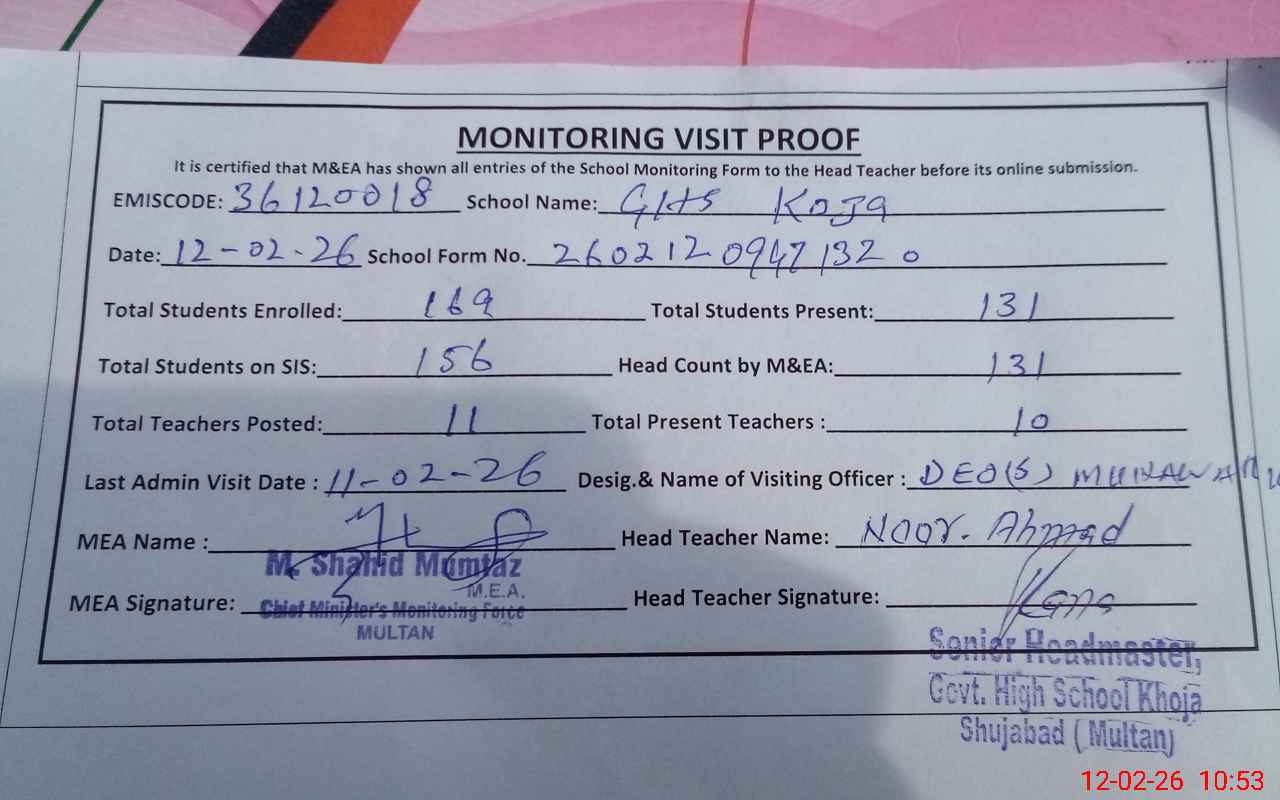 | EMIS Code: 36120018 | Name of School: GHS KHOJA P.O. KHOJA TEH. SHUJABAD DISTRICT MULTAN | |||