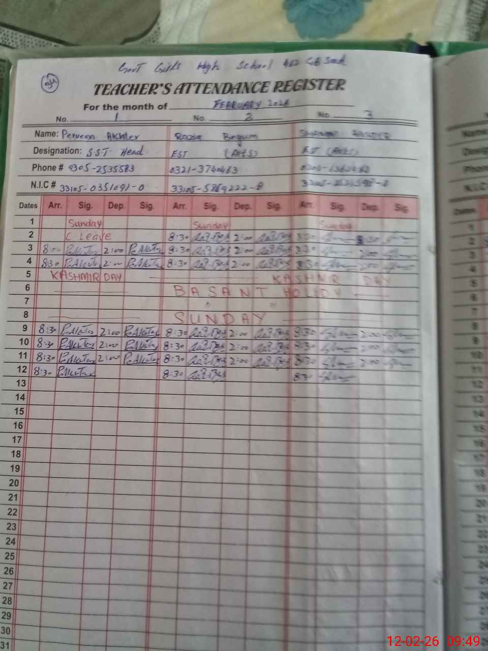| CNIC | Full Name | Designation | R/C | Absence During Last Calender Month |