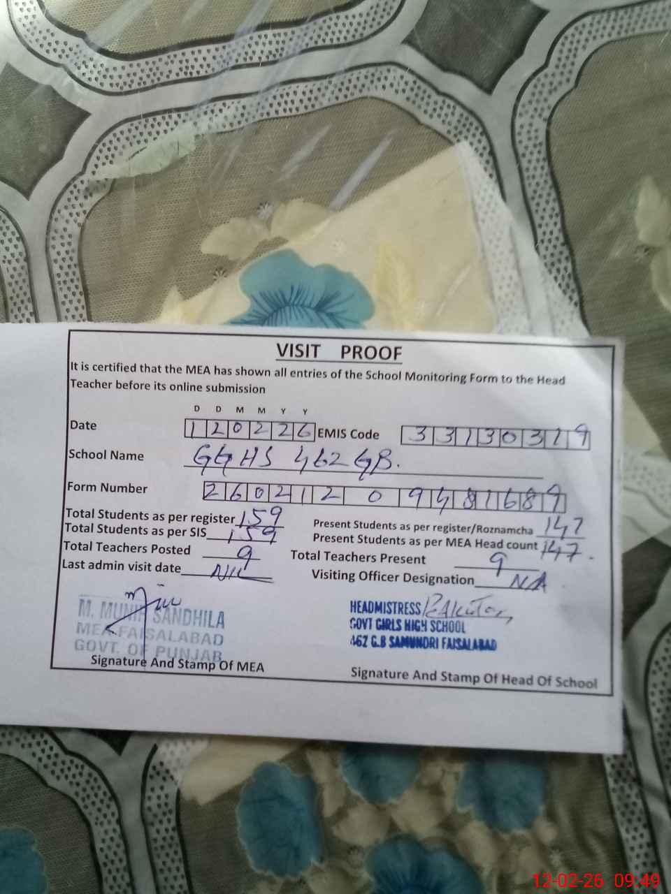 | Certified that this School was Inspected by the Undersigned MEA/DMO Today and the Information Stated Above is as Per Record. | |||||