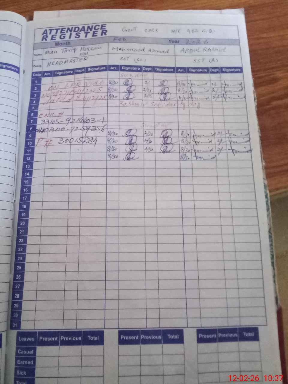 | CNIC | Full Name | Designation | R/C | Absence during last cal. month |