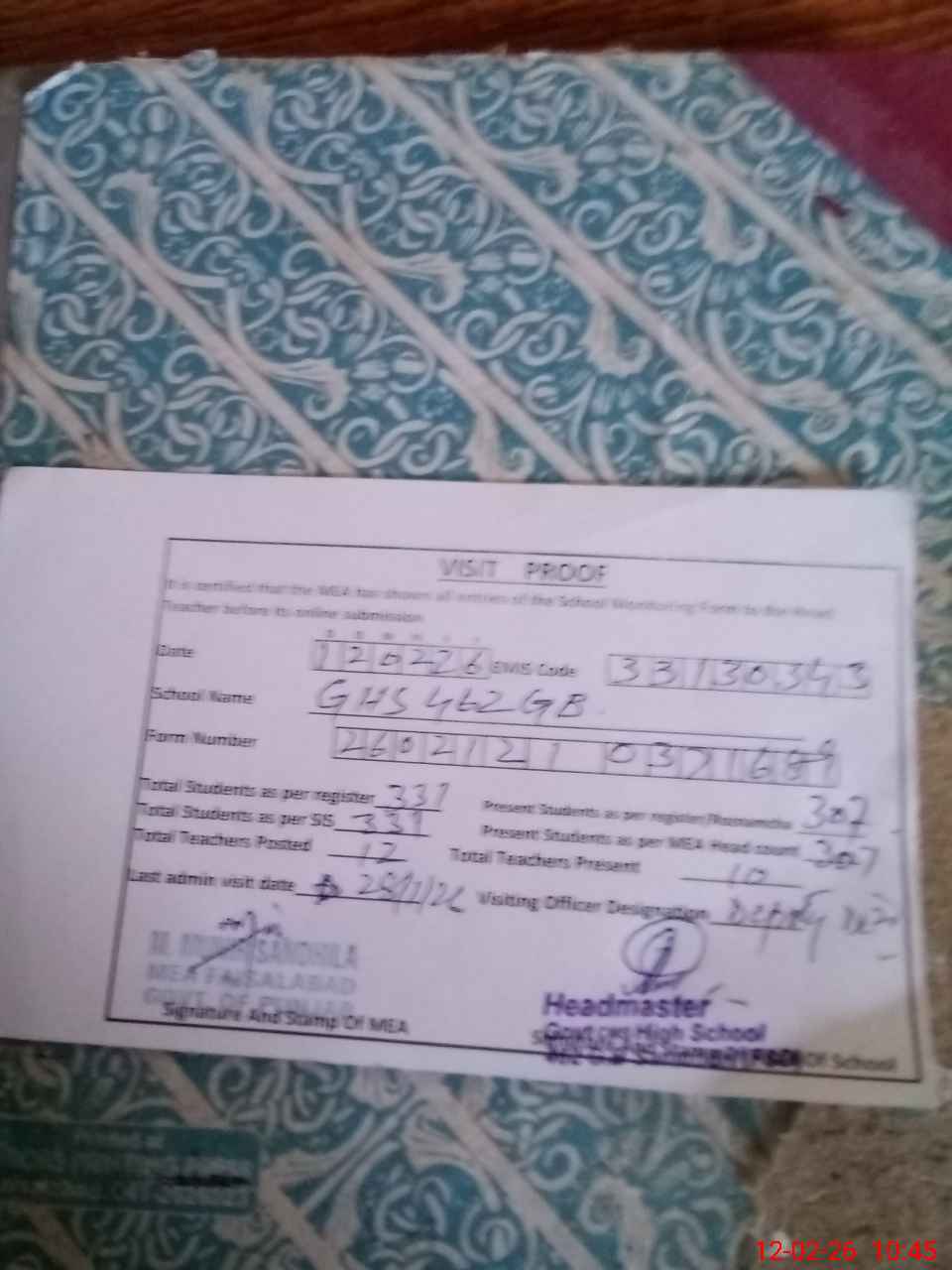 | Attendance Register | Head Teacher | MEA with School | Visit Proof |