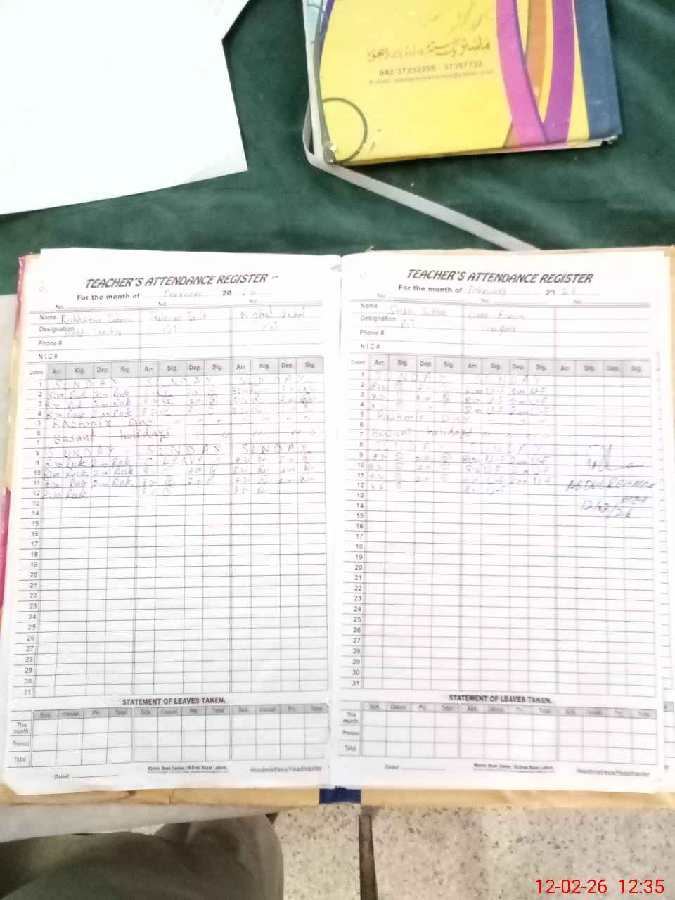 | CNIC | Full Name | Designation | R/C | Absence During Last Calender Month |