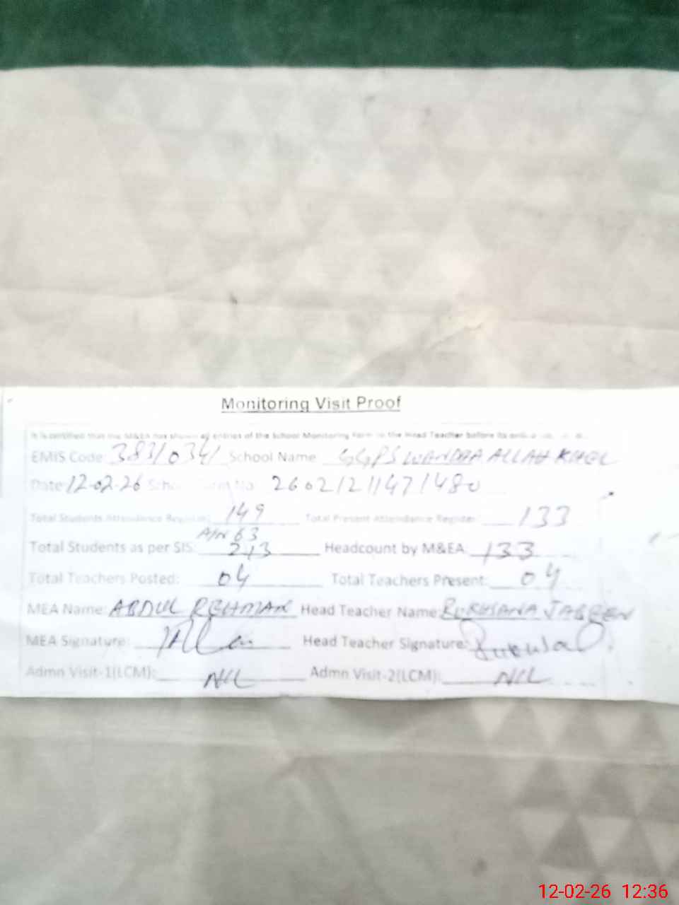 | Attendance Register | Head Teacher | MEA with School | Visit Proof |