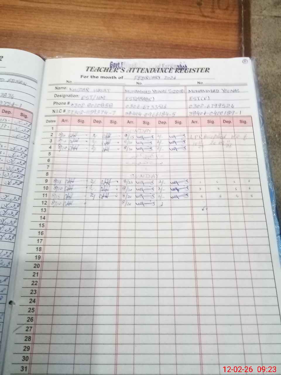 | Name: Kh**** Ha**** Designation: (School Headmaster's/Headmistress's) EST I/C HEADMASTER Phone/Cell Number: 03**** |