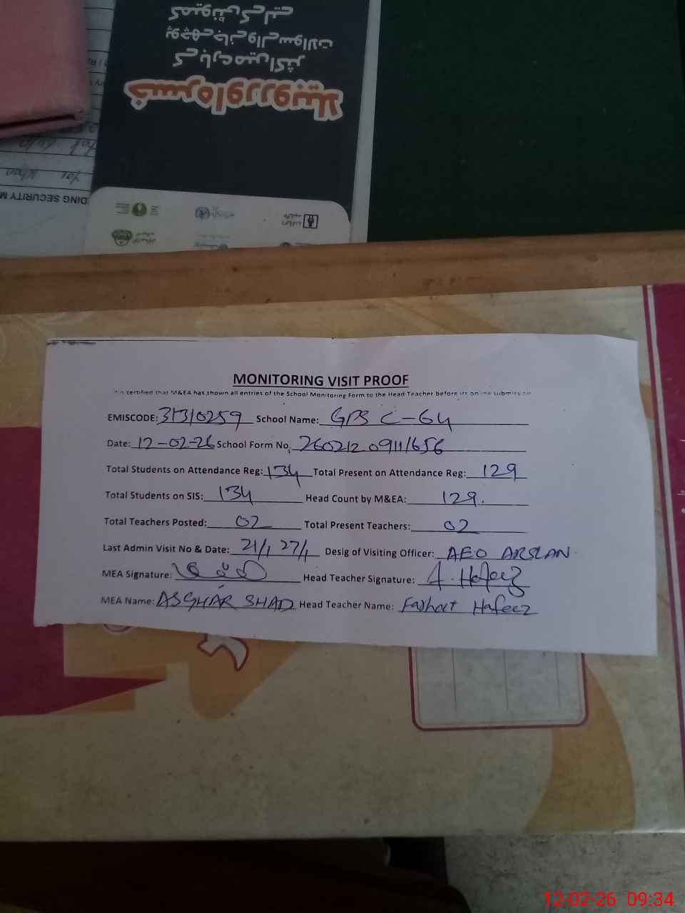| Attendance Register | Head Teacher | MEA with School | Visit Proof |