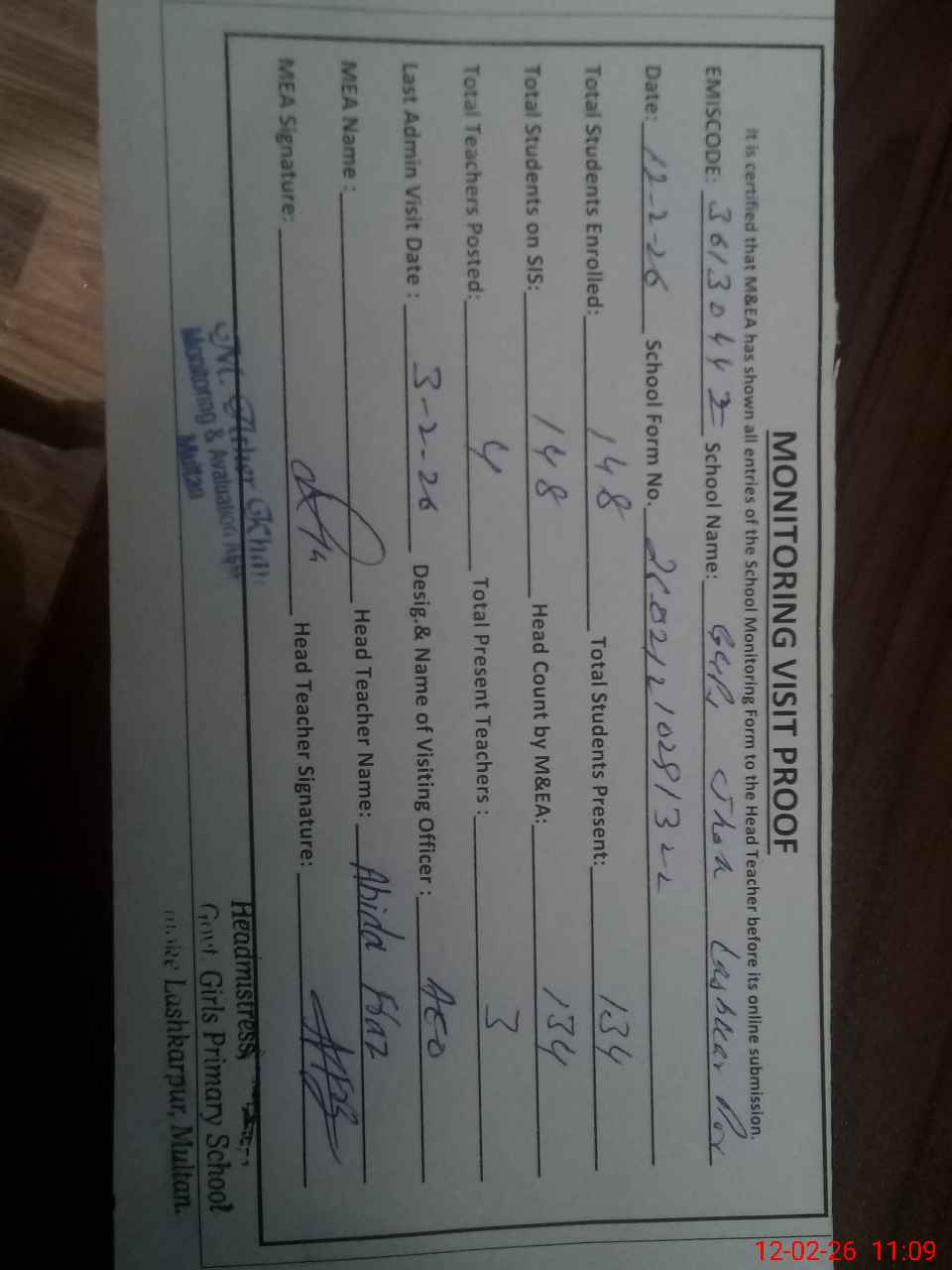 | EMIS Code: 36130442 | Name of School: GGPS JHOK LASHKAR PUR | |||