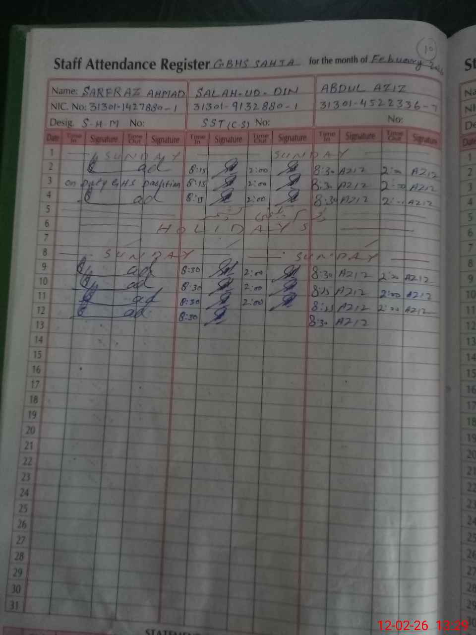 | CNIC | Full Name | Designation | R/C | Absence During Last Calender Month |