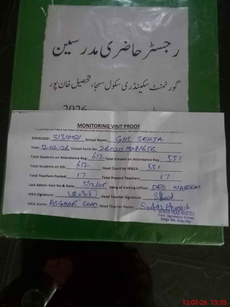 | Attendance Register | Head Teacher | MEA with School | Visit Proof |