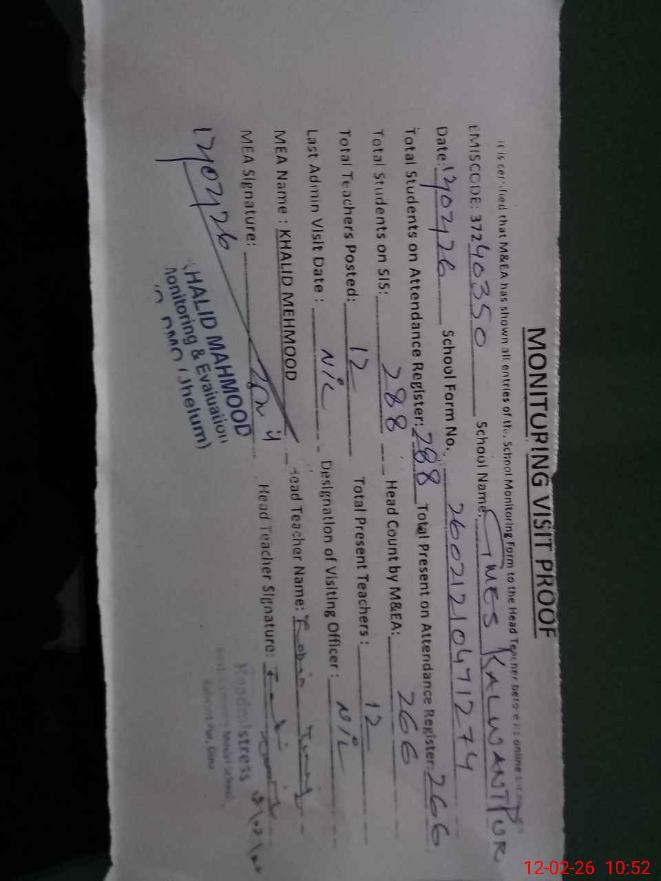 | Attendance Register | Head Teacher | MEA with School | Visit Proof |