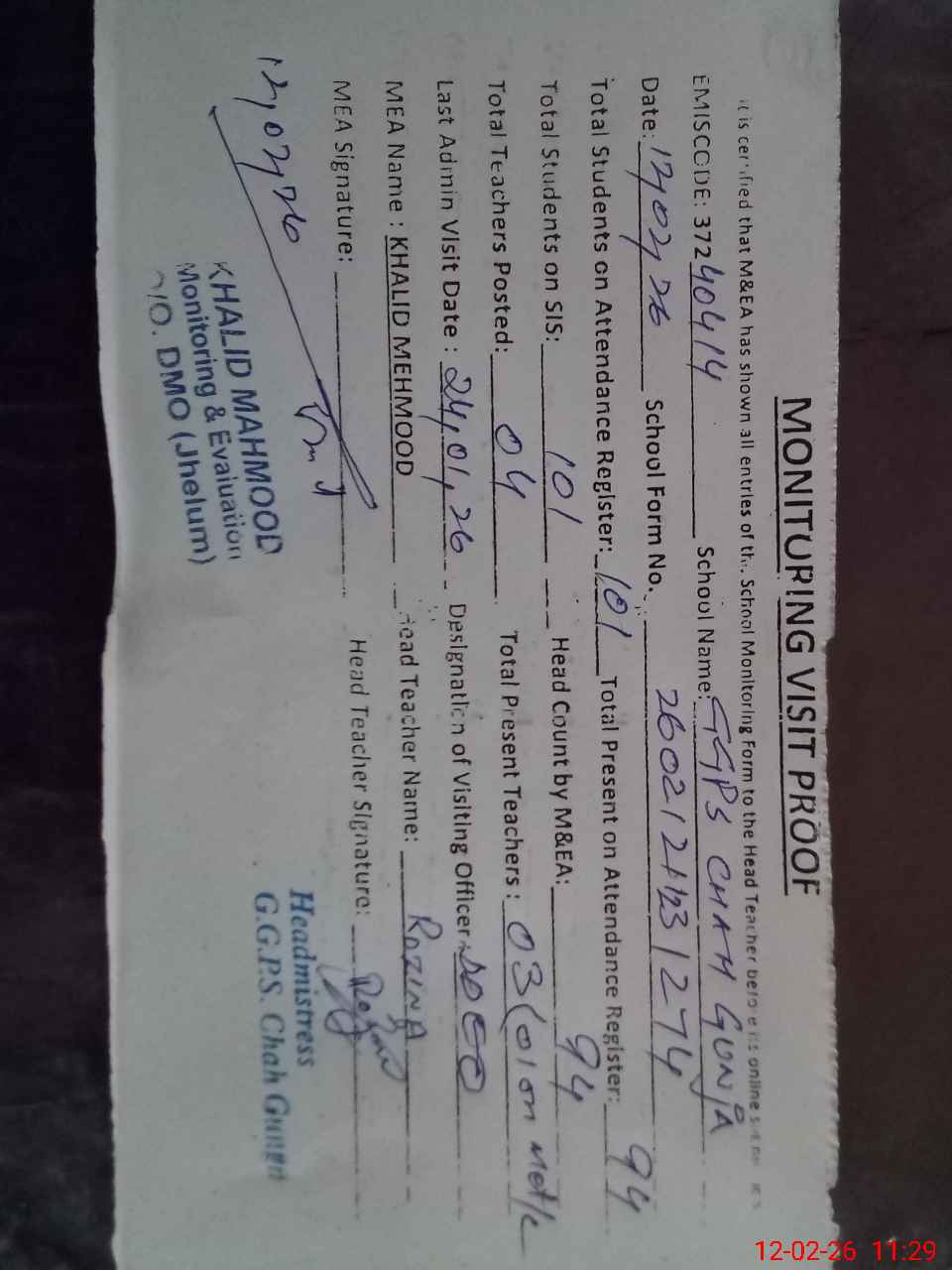| Attendance Register | Head Teacher | MEA with School | Visit Proof |