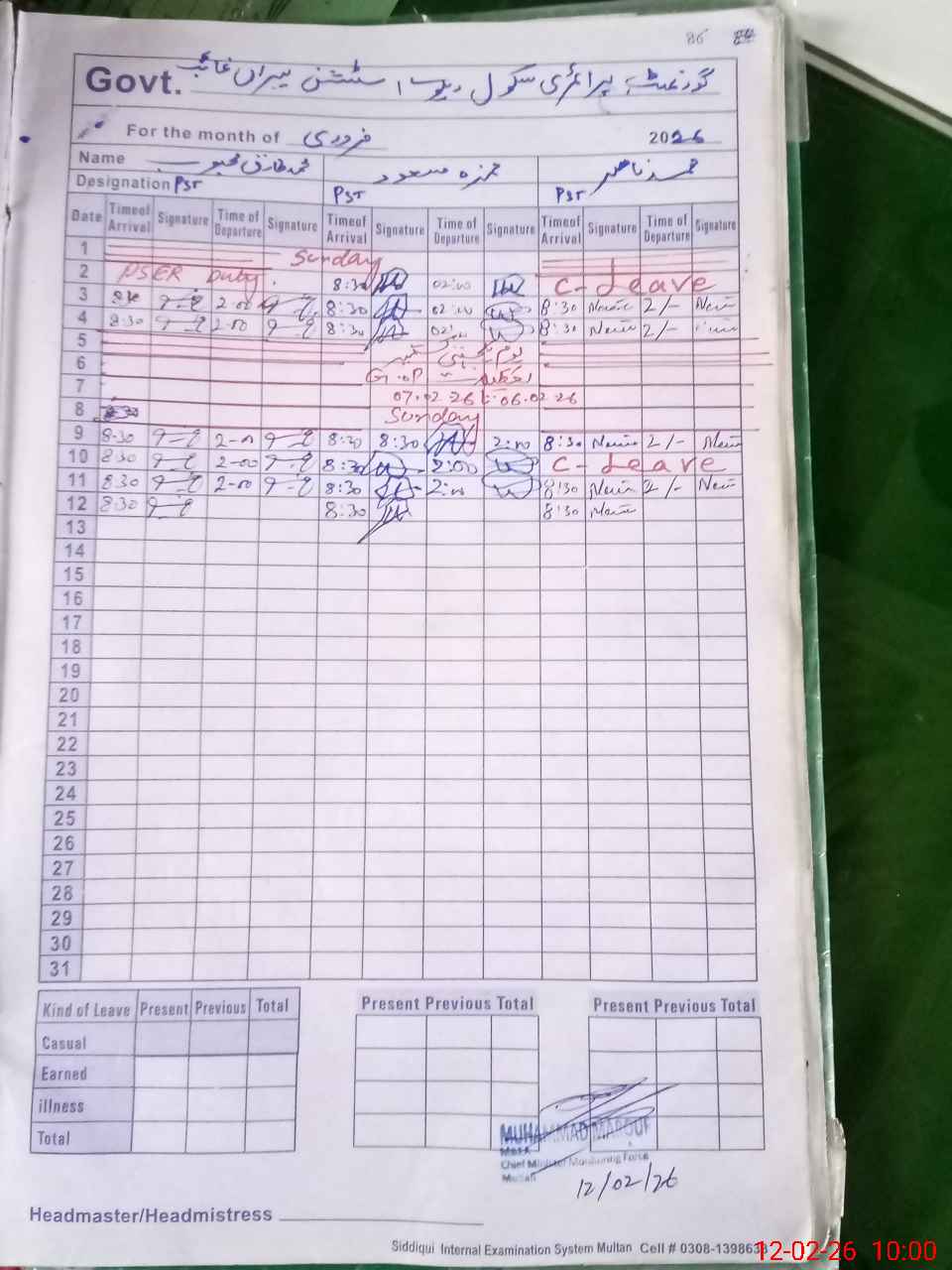 | CNIC | Full Name | Designation | R/C | Absence During Last Calender Month |
