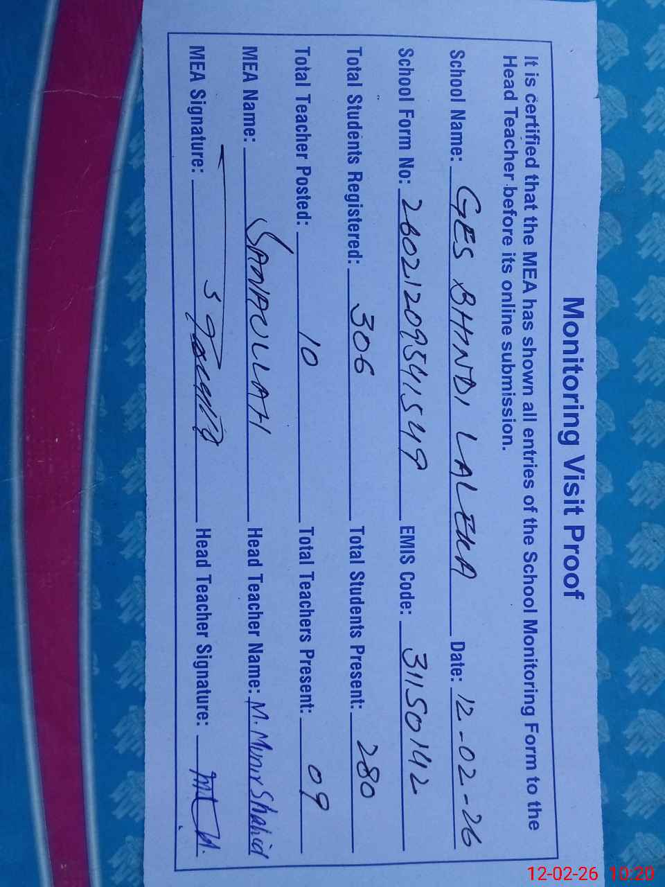 | Attendance Register | Head Teacher | MEA with School | Visit Proof |