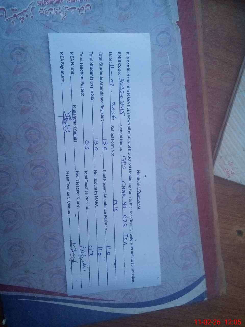 | Attendance Register | Head Teacher | MEA with School | Visit Proof |