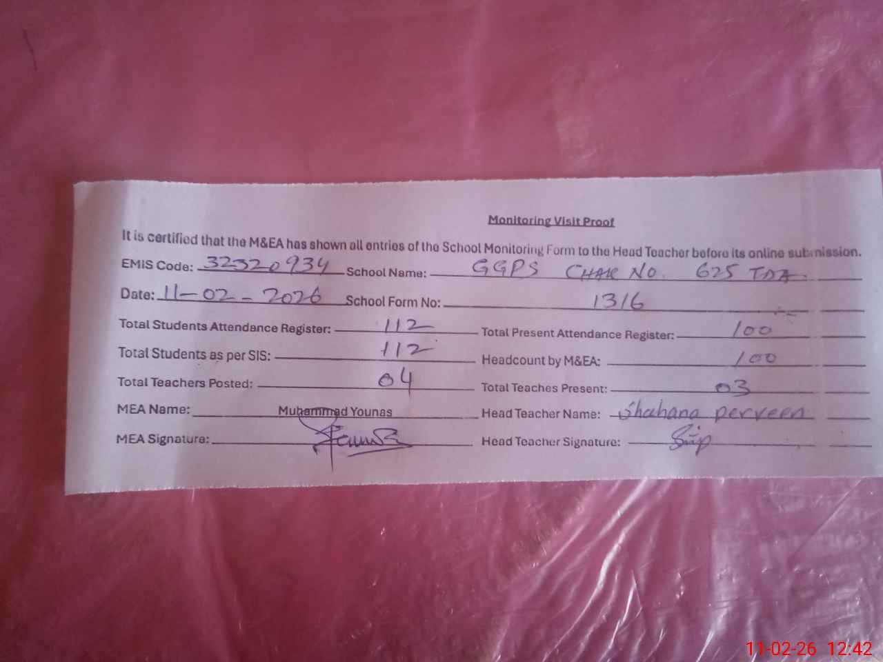 | Attendance Register | Head Teacher | MEA with School | Visit Proof |
