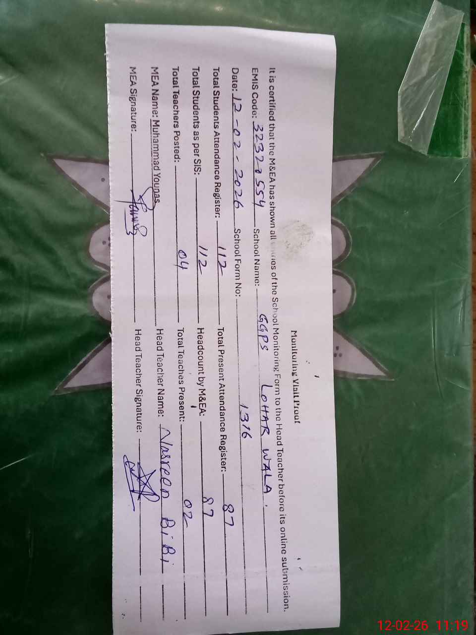 | Attendance Register | Head Teacher | MEA with School | Visit Proof |