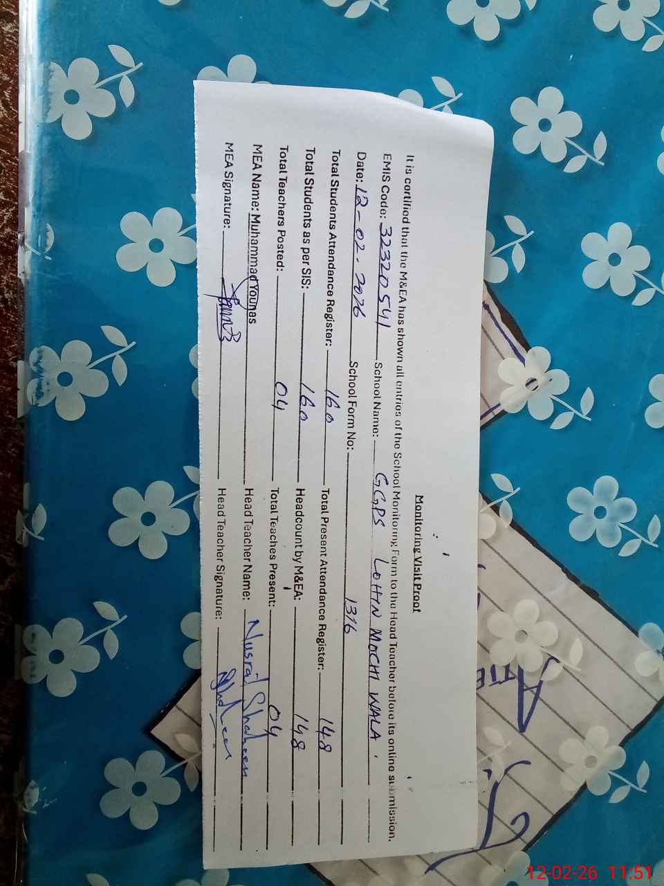 | Attendance Register | Head Teacher | MEA with School | Visit Proof |