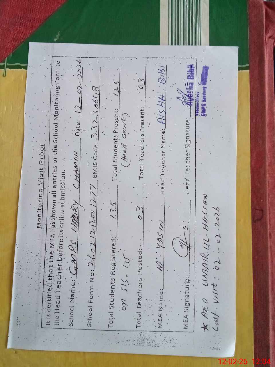 | EMIS Code: 33230648 | Name of School: GMPS HAYDRI CHAMAN | |||