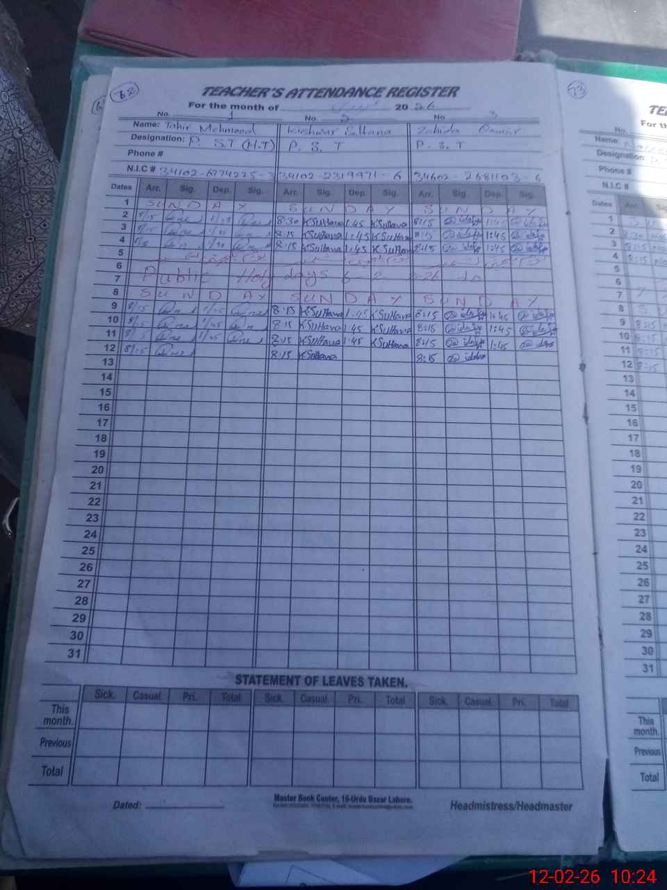 | Remarks (Use Separate Page if Required): zahida qamar PST found absent but her attendance was marked | |||||