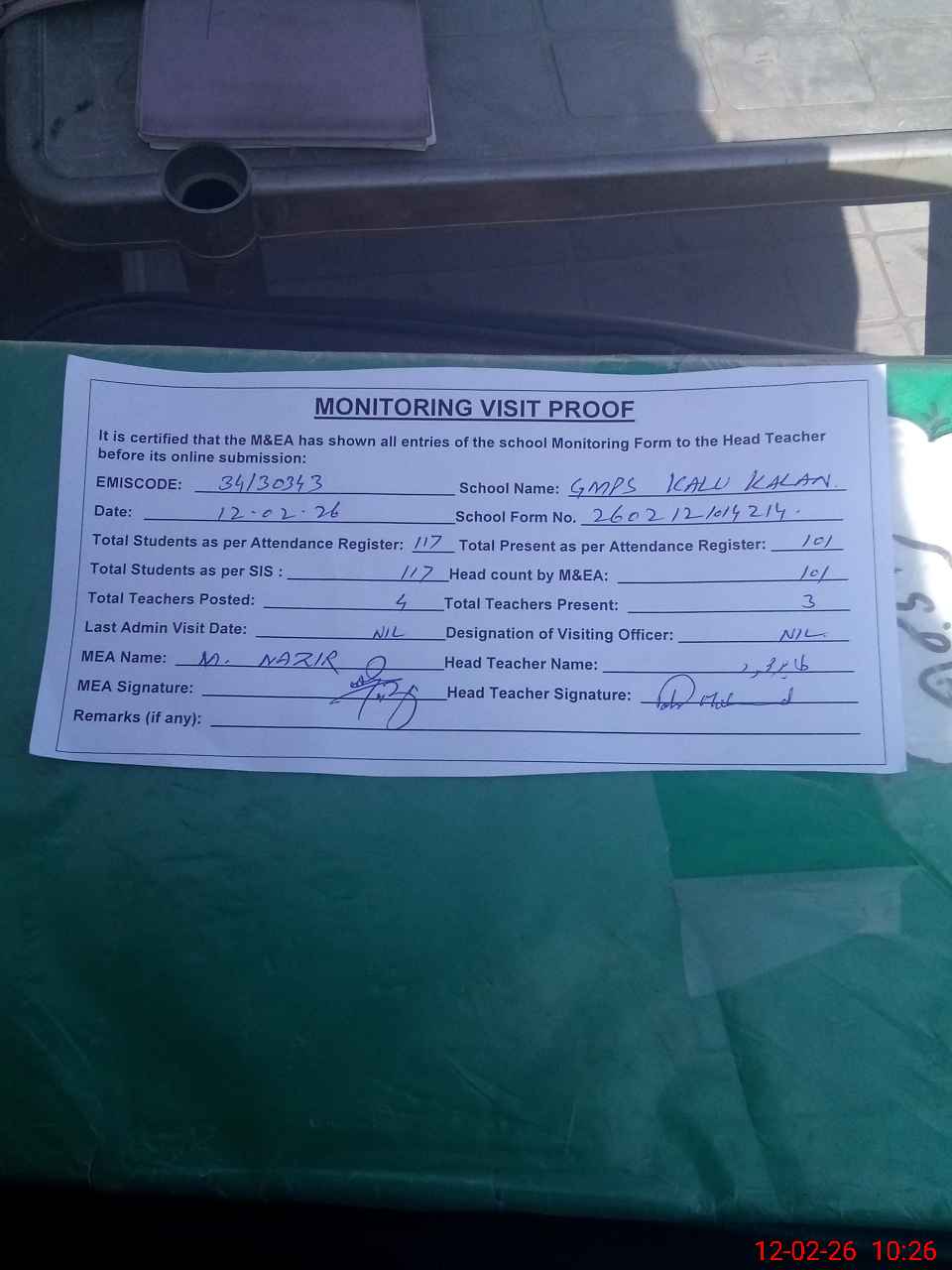 | Attendance Register | Head Teacher | MEA with School | Visit Proof |