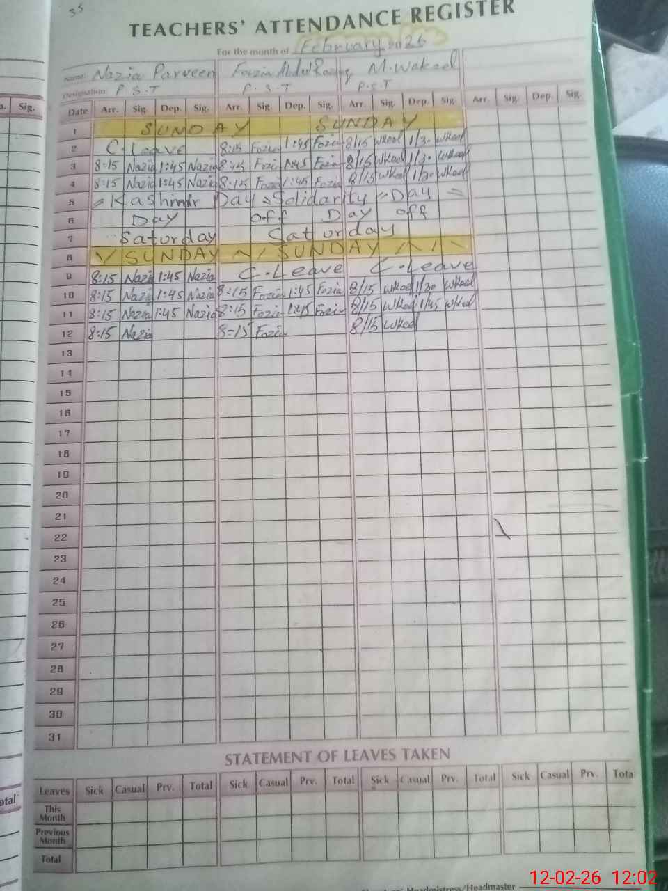 | Leave | Duty | Absent | Maternity | Medical | Ex- Pak |