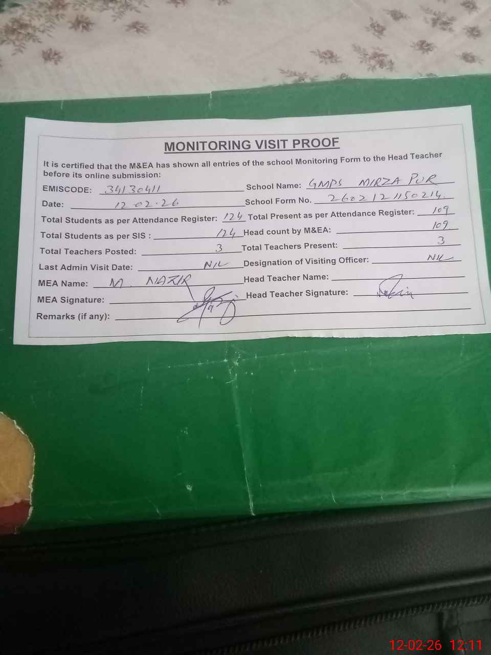 | Attendance Register | Head Teacher | MEA with School | Visit Proof |