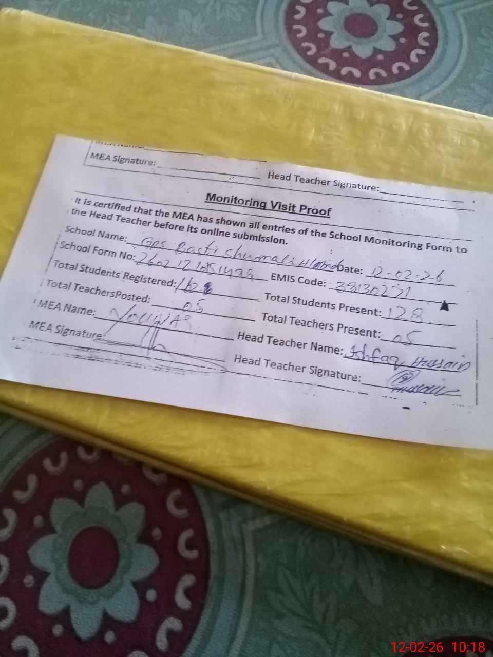 | Attendance Register | Head Teacher | MEA with School | Visit Proof |