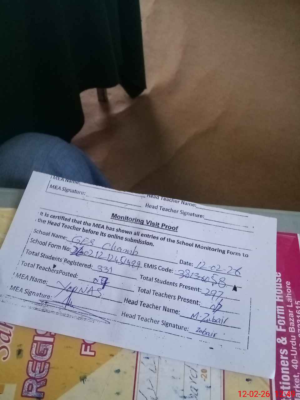 | Attendance Register | Head Teacher | MEA with School | Visit Proof |
