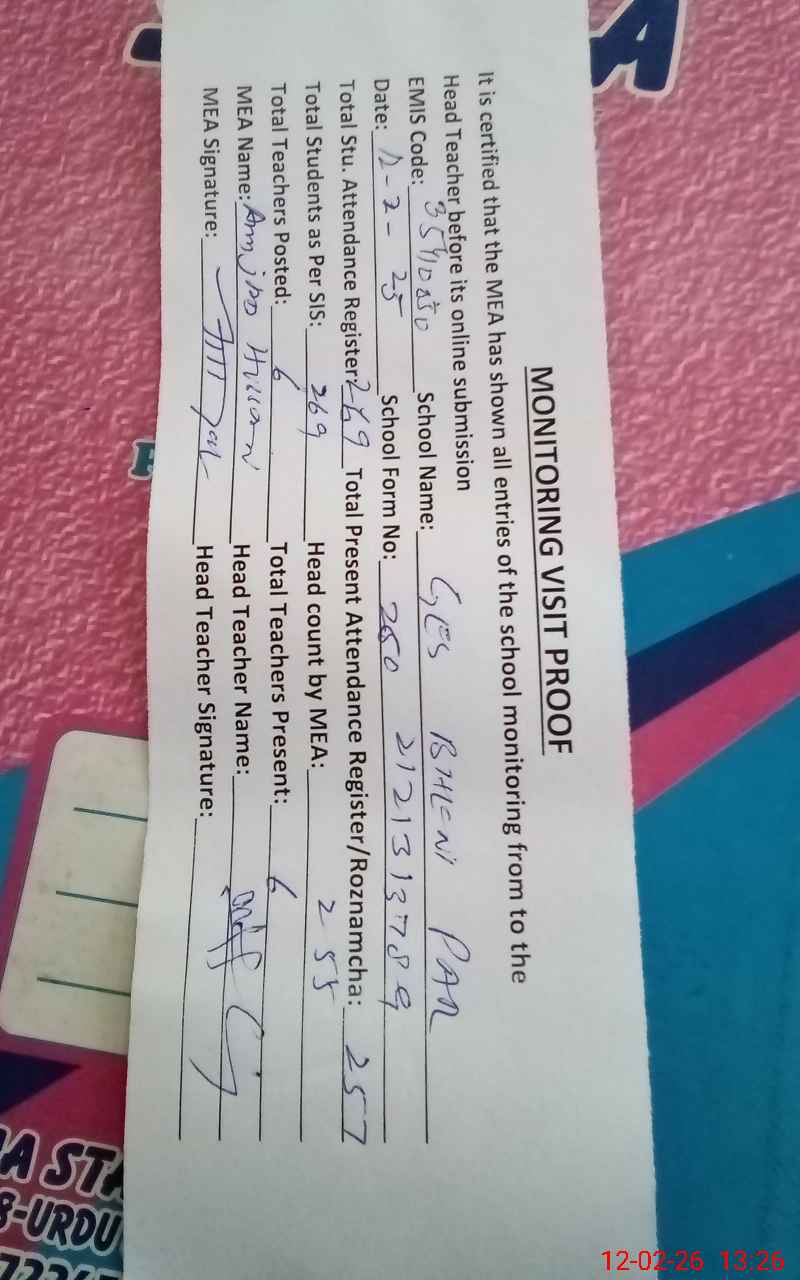 | Attendance Register | Head Teacher | MEA with School | Visit Proof |