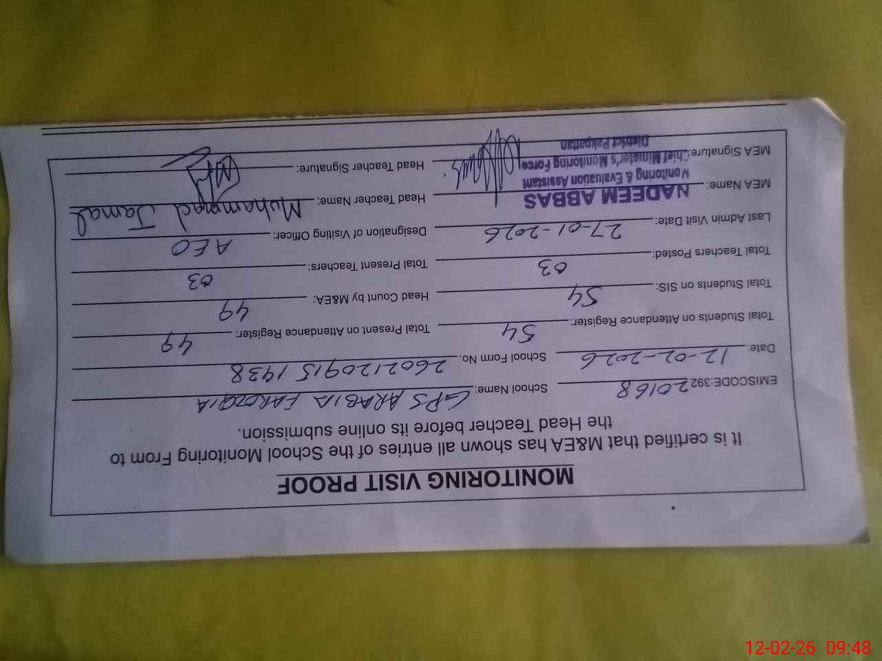 | Attendance Register | Head Teacher | MEA with School | Visit Proof |