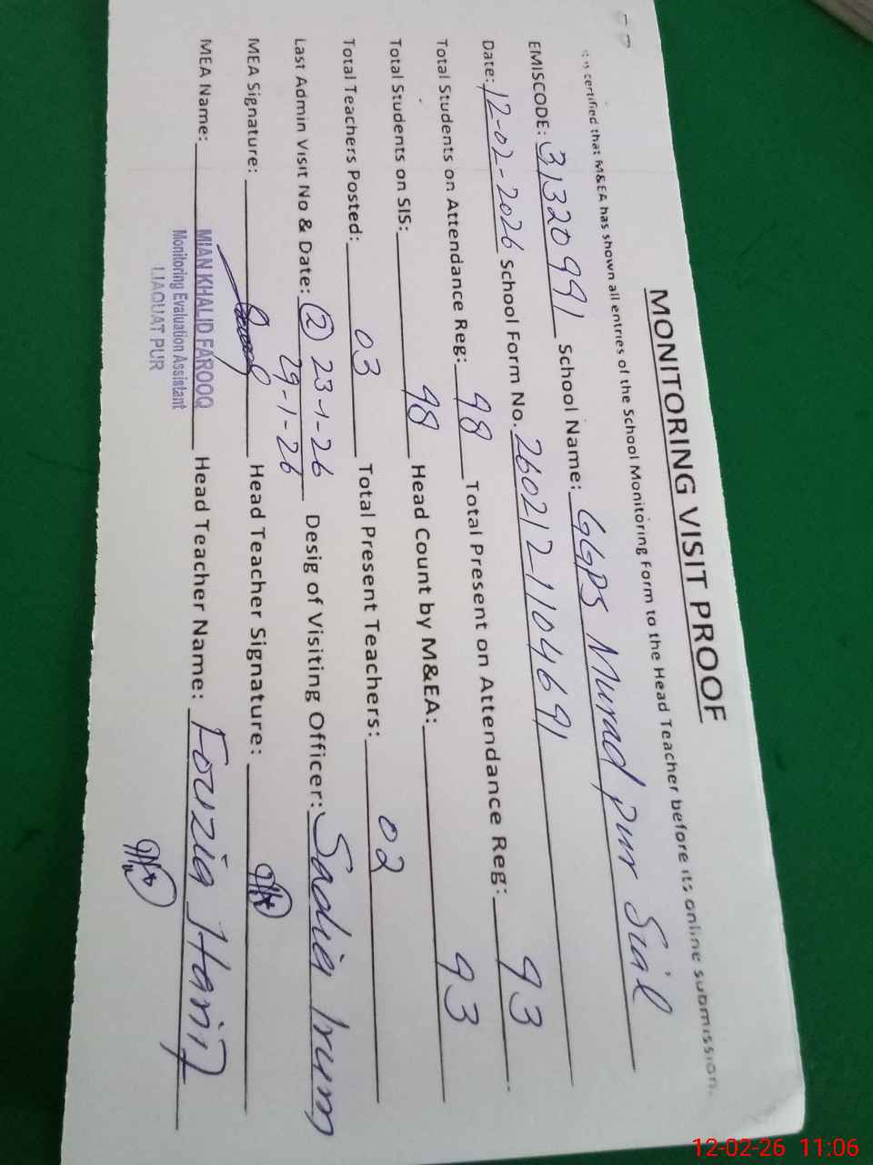 | Attendance Register | Head Teacher | MEA with School | Visit Proof |