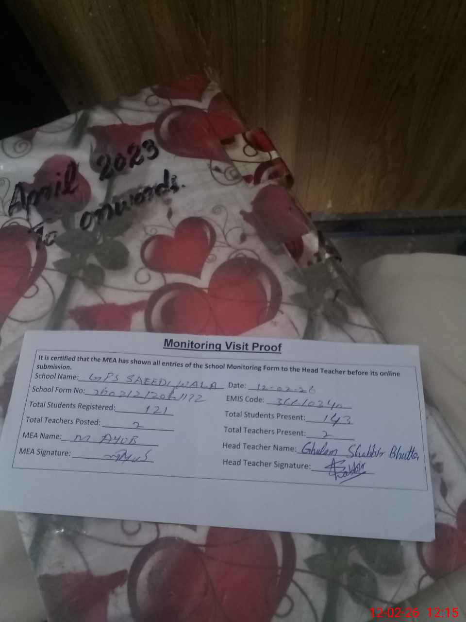 | Attendance Register | Head Teacher | MEA with School | Visit Proof |