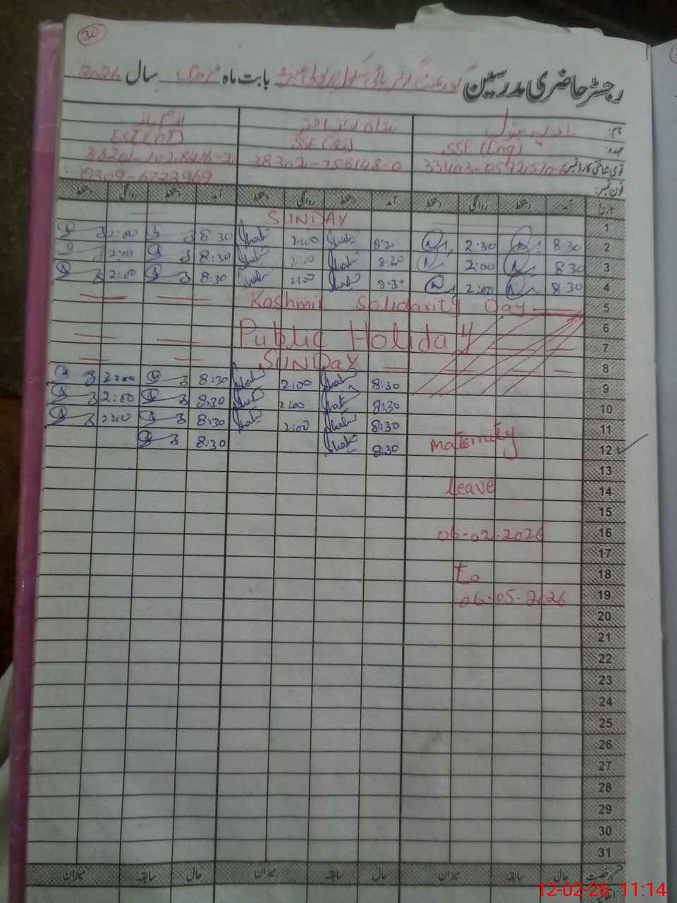 | 33**** | Na**** Ba**** | SSE English | Contract | 0 | 0 | 0 | 0 | 0 | 0 | 0 | 0 | 0 | Maternity |