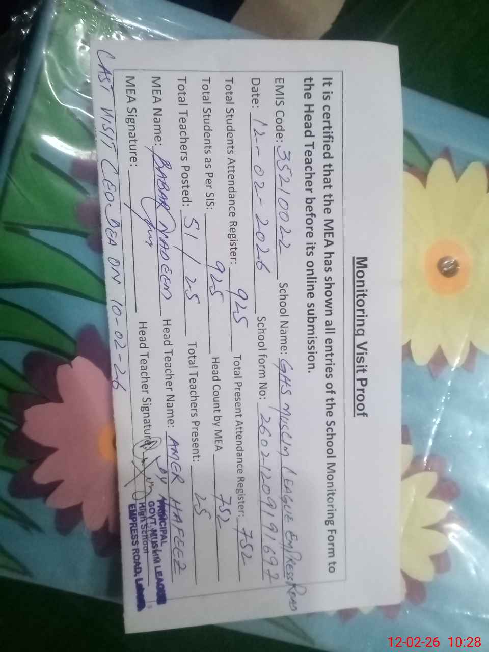 | Certified that this School was Inspected by the Undersigned MEA/DMO Today and the Information Stated Above is as Per Record. | |||||
