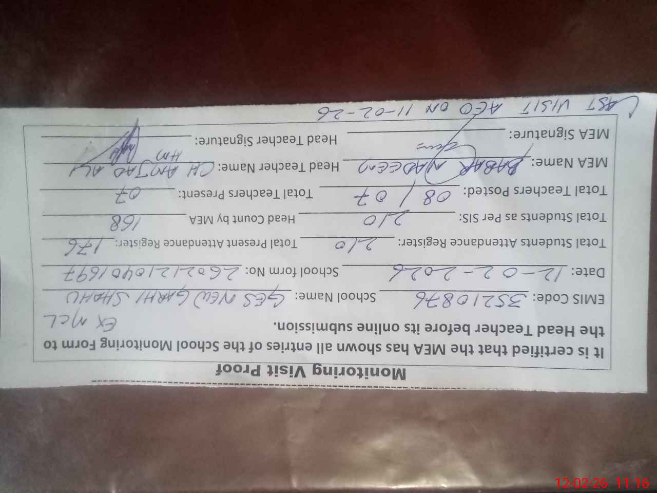 | Attendance Register | Head Teacher | MEA with School | Visit Proof |