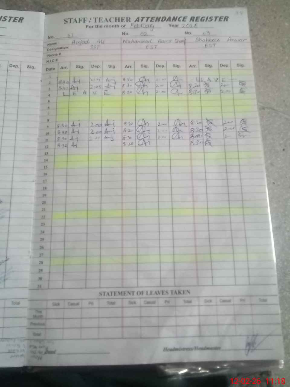 | CNIC | Full Name | Designation | R/C | Absence During Last Calender Month |