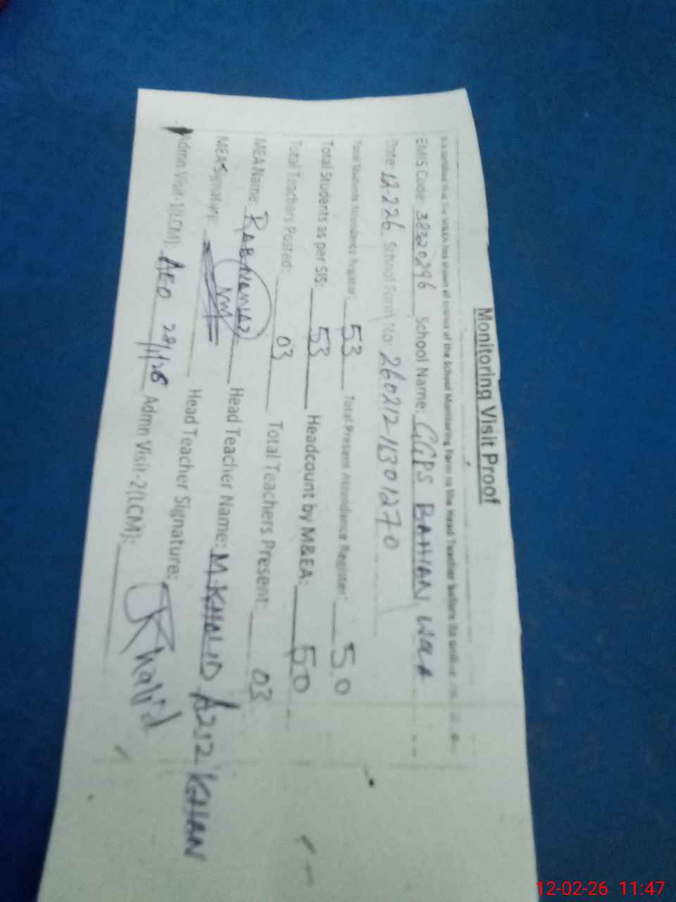 | EMIS Code: 38320296 | Name of School: GPS BAHIAN WALA | |||