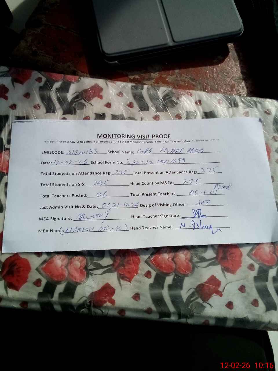 | Attendance Register | Head Teacher | MEA with School | Visit Proof |