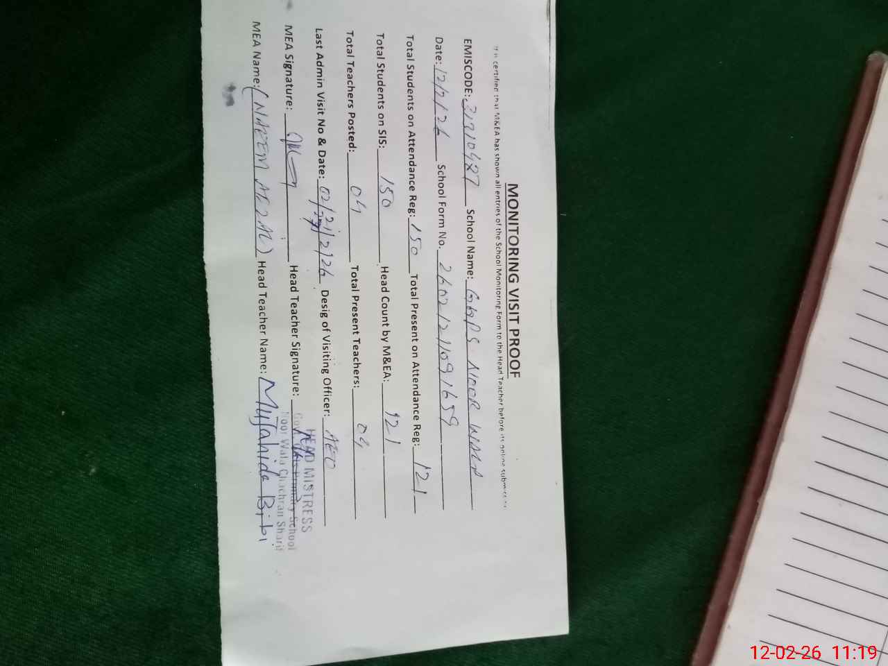 | Attendance Register | Head Teacher | MEA with School | Visit Proof |