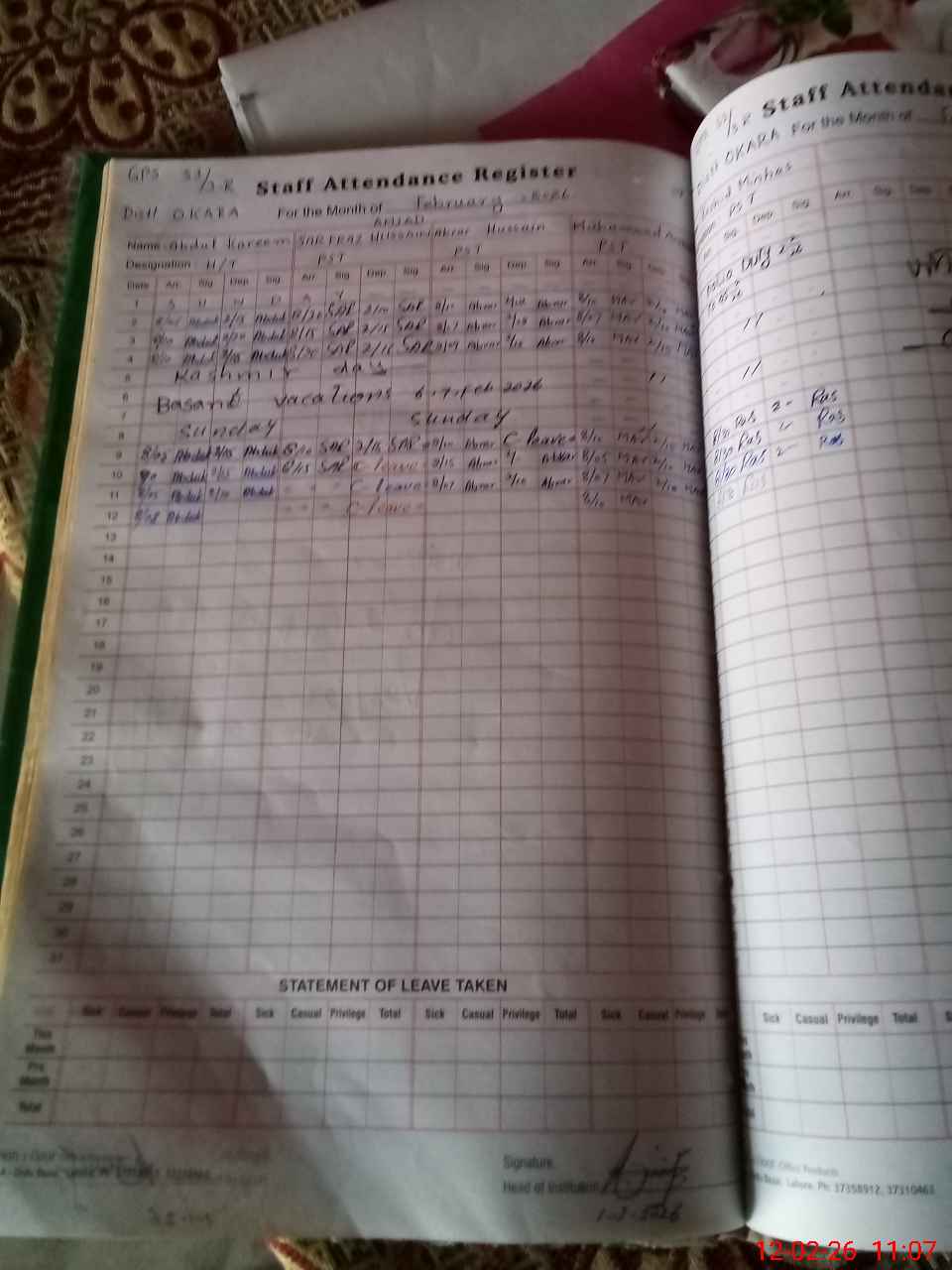 | CNIC | Full Name | Designation | R/C | Absence During Last Calender Month |