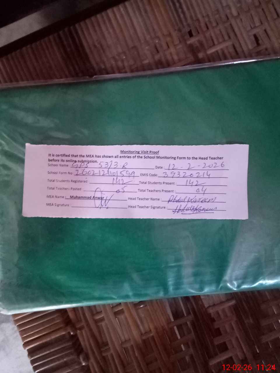 | Attendance Register | Head Teacher | MEA with School | Visit Proof |