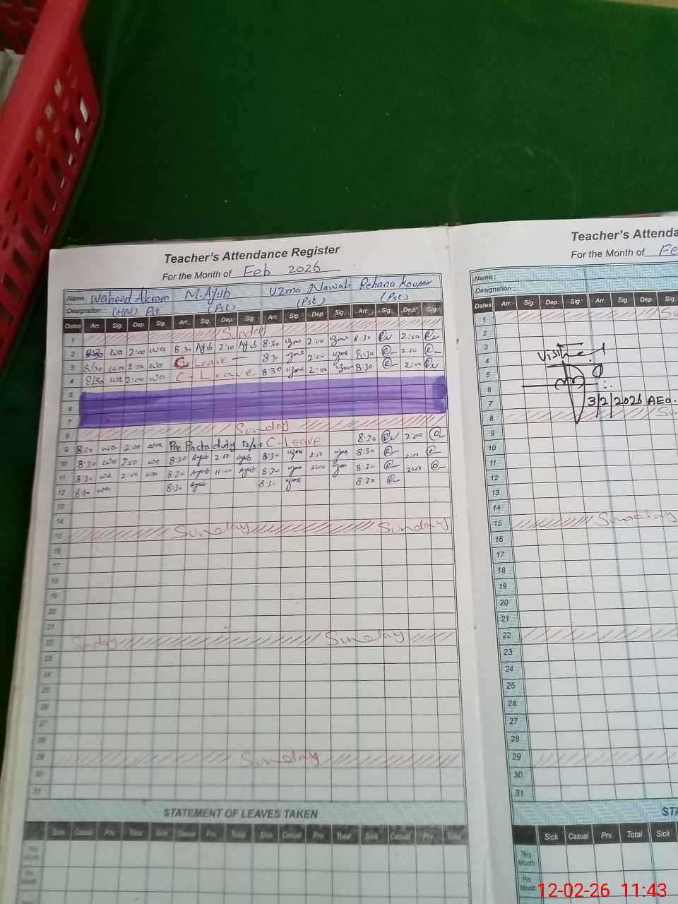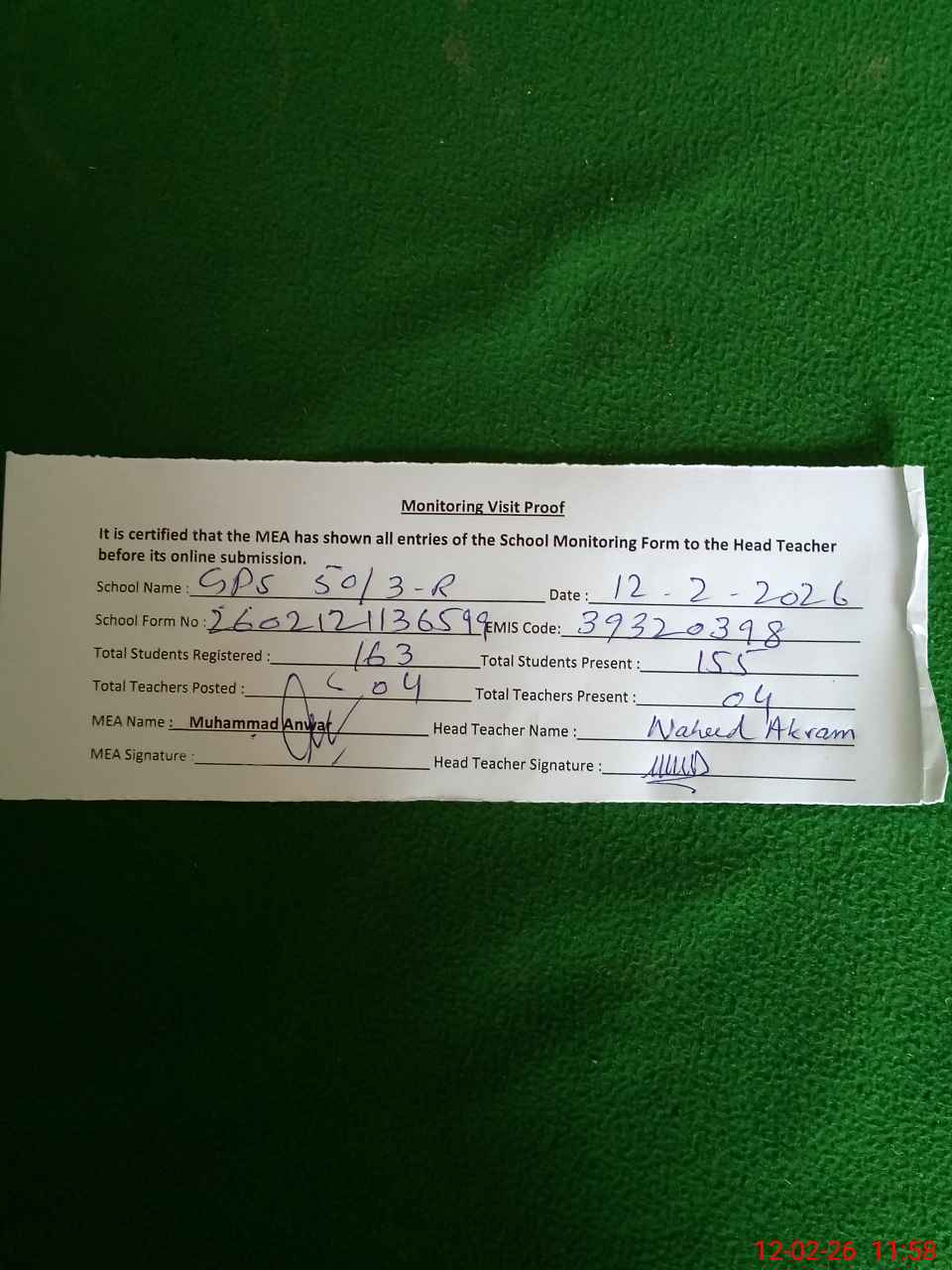 | Attendance Register | Head Teacher | MEA with School | Visit Proof |