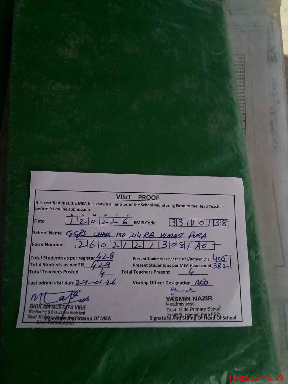 | Attendance Register | Head Teacher | MEA with School | Visit Proof |