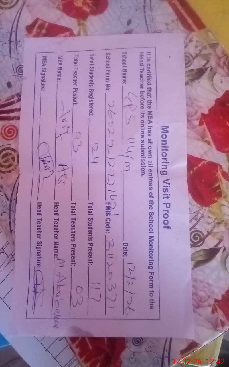 | EMIS Code: 31120371 | Name of School: GPS CHAK NO. 114 M | |||